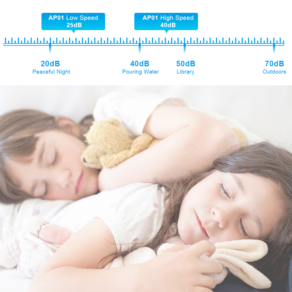 CADR is up to 110 m3/h, purifying 15-20m²rooms 3-4 times per hour, and comes with 3 speeds setting, noise down to 40dB, give you peace of sleep and work.