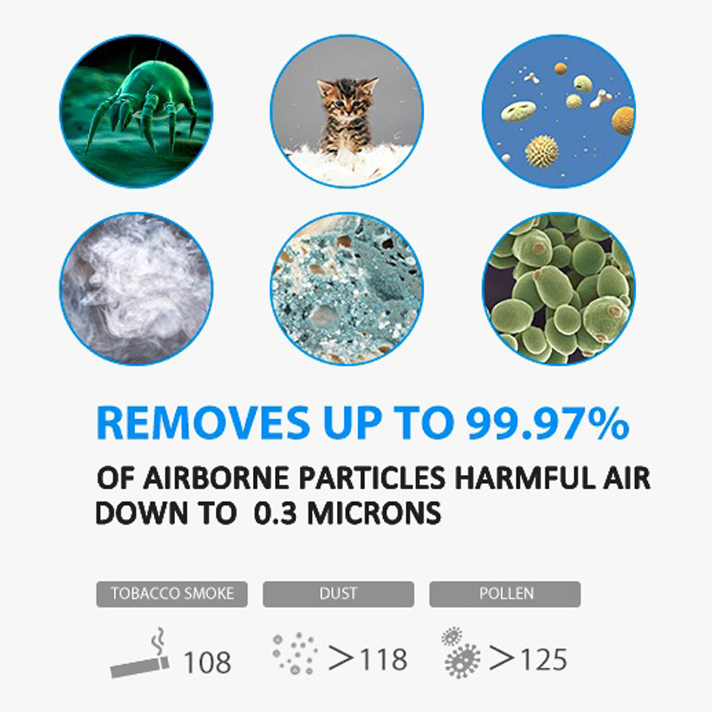 Air Purifiers for Allergies includes a high  efficiency HEPA filter and a honey comb activated carbon filter. Could capture 99.7% Smoke, Virus, Pet Dander and Dust, helping to improve air quality in your room. Ideal for use in home, office,