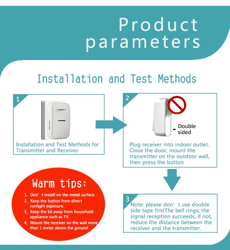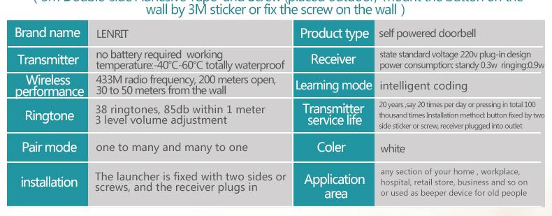 Outdoor button adopts self powered technology chip, no battery required, once someone pressing the button to offer force, it can automatically change the motion energy into electricity which can make signals to ring the indoor receiver.