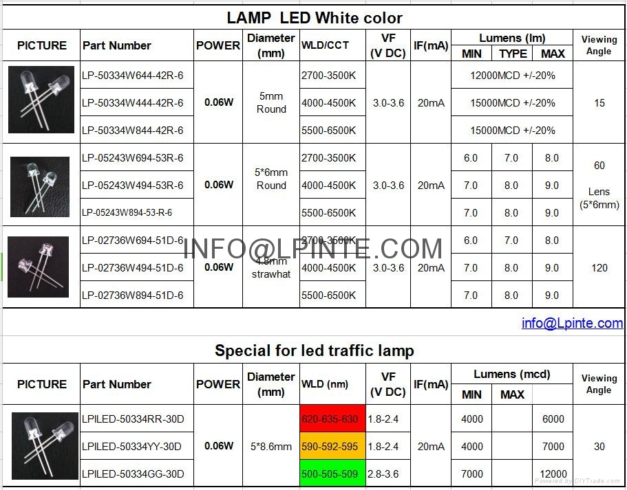 | LP-50334W644-42R-6 | 0.06W | 5mm Round | Warm white | 2700-3500K | 3.0-3.6 | 20mA | 12000MCD +/-20% | 15 | ||