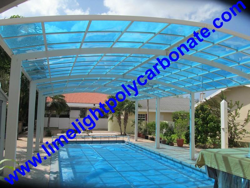 2). Roofing/Shading Material: Polycarbonate solid sheet is made of 100% virgin materials from Bayer and Lexan, with one side 50 micron UV layer, prevent 99.9% harmful UV.