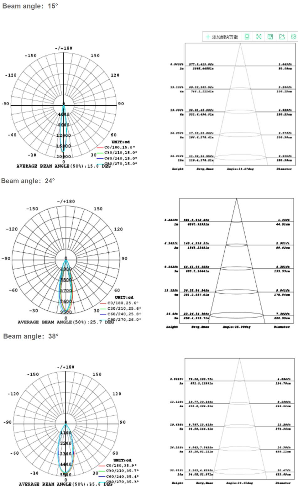 | Beam angle | 12°, 24°, 38°, 60° |